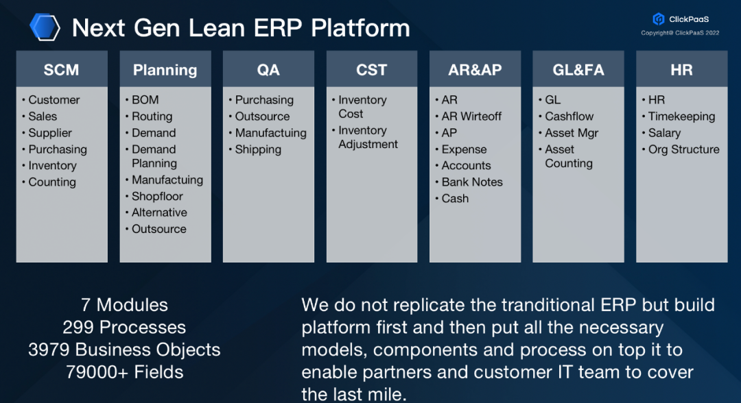 凯发k8旗舰厅把这样的逻辑同样应用到了工业领域。比如在纷繁复杂的泛ERP场景中,凯发k8旗舰厅把ERP场景中的核心模型内置在元数据模型平台上,并不是复制一个传统ERP,而是把核心的模型、组件、流程开放性的构建完善,支持凯发k8旗舰厅的伙伴和客户通过一个瘦身的Lean ERP Platform进行扩展开发的逻辑构建最后一公里的业务实现。